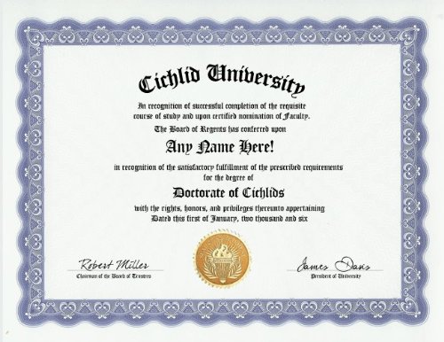 I highly recommendCichlid Degree: Custom Gag Diploma Doctorate Certificate (Funny Customized Joke Gift - Novelty Item)